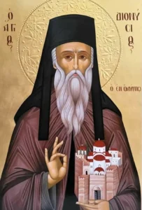 Τοῦ Ὀλύμπου οἰκήτωρ Πιερίας ἀγλάισμα, καὶ τῆς ἐπωνύμου Μονῆς σου ἱερὸν περιτείχισμα, ἐδείχθης Διονύσιε σοφέ, βιώσας ὥσπερ Ἄγγελος ἐν γῇ, καὶ παρέχεις τὴν ταχεῖαν σου ἀρωγήν, τοὶς εὐλαβῶς κραυγάζουσιν δόξα τῷ δεδωκότι σοὶ ἰσχύν, δόξα τῷ σὲ θαυμαστώσαντι, δόξα τῷ ἐνεργούντι διὰ σοῦ πάσιν ἰάματα.